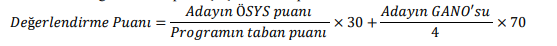 Merkezî yerleştirme puanı ile öğrenci alan programlara başvuru yapan adayların değerlendirilmesinde, adayın başvuru yaptığı ÖSYS puan türünde almış olduğu ÖSYS puanı ve 4,00 üzerinden GANO’su dikkate alınır. Aşağıdaki formüller kullanılarak birim içi ve birimler arası geçişler için adayın yüz üzerinden değerlendirme puanı hesaplanır.